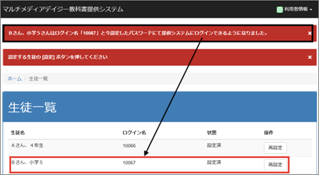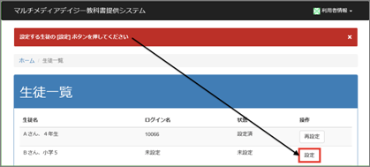 - 「生徒一覧」画面に表示されている各生徒の【設定】ボタンをクリックします。