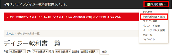マルチメディアデイジー教科書の申請後、追加や訂正を申請される場合は(登録済の)マルチメディアデイジー教科書提供システムから操作してください。