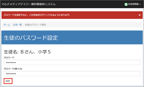 - 「生徒のパスワード設定」画面にてパスワード・パスワード(再入力)を入力(半角英数記号10文字以上で推定が困難なもの)して【設定】をクリックします。