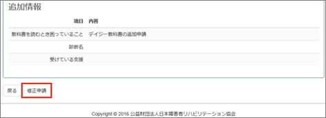 - 承認済の「マルチメディアデイジー教科書提供申請内容」画面が表示されますので、画面最下の【修正申請】ボタンをクリックします。