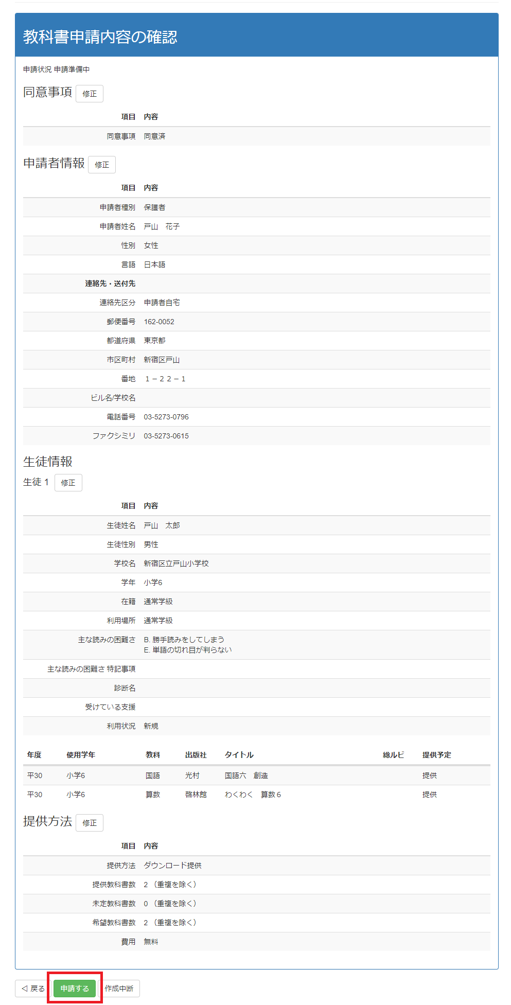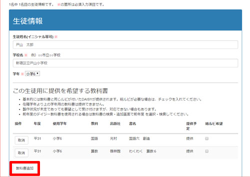 ※ 画面の順番は、「申請者情報」、「生徒情報(教科書の削除、追加)」、「提供方法」、「申請内容の確認」です。下図は教科書追加の画面例です。