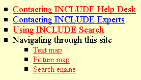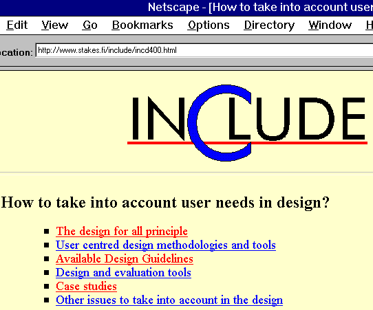 The server has links to national INCLUDE servers and to outside sources of information including also issues like assistive devices, tools for achieving Design for All and ongoing research. Users can find answers to specific questions by contacting INCLUDE Help Desk, using the INCLUDE search engine, contacting INCLUDE experts or just by navigating through the INCLUDE Web site (text map, picture map) where there are headlines like: