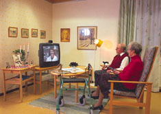 | Familiar and readily available technical apparatus, such as the carers’ own TV and remote control complemented with a multimedia PC, a camera and ISDN connection, will be used (Emery, 1997). For the family carer a remote control hand set will be used to operate the system, permitting the user to switch between TV and ACTION facilities (figure 2). | ![]() Figure 2. Receiving advice about caring |